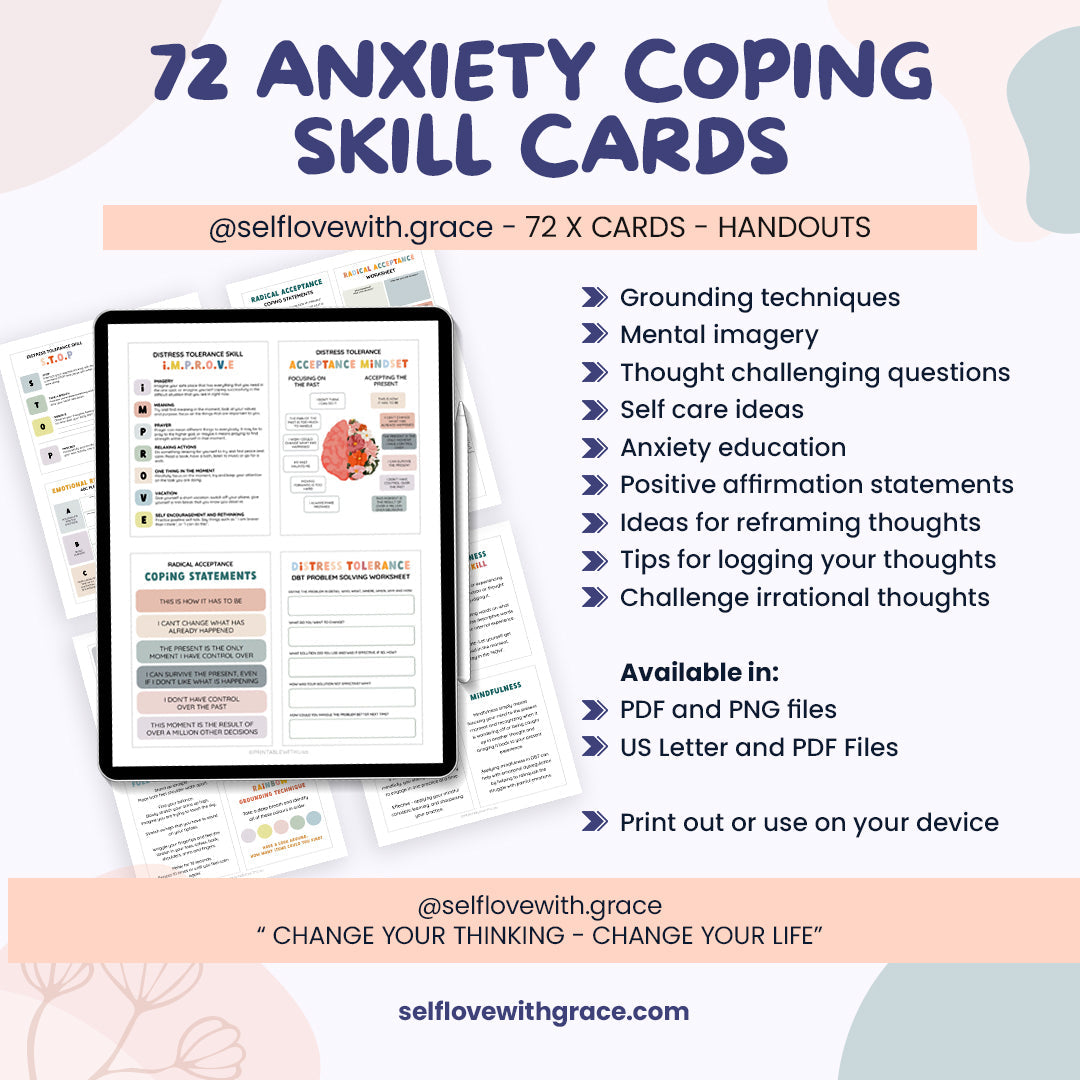 Introducing our Anxiety Coping Skill Flashcards – a versatile and effective tool designed to empower individuals in their journey towards anxiety relief and improved mental well-being. These flashcards serve as a comprehensive set of coping strategy cards, offering valuable insights and practical techniques to manage and alleviate anxiety.